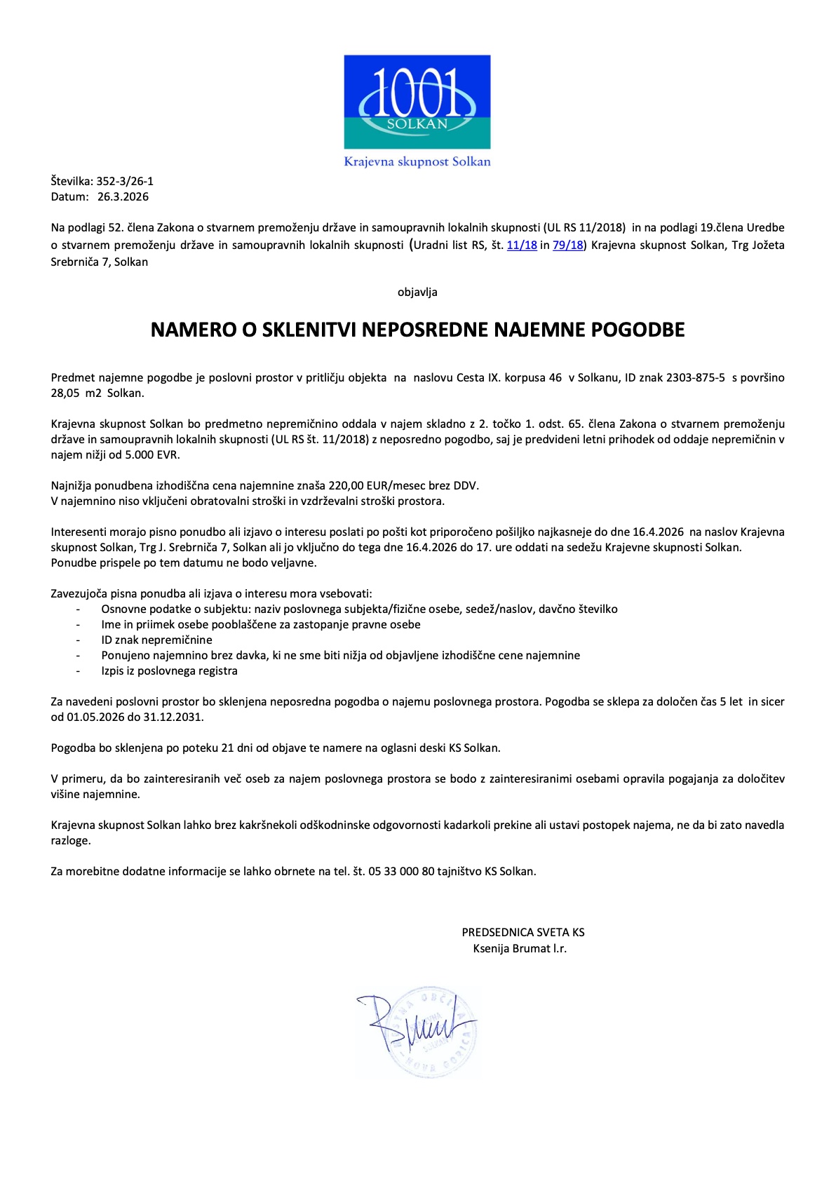 Namera o sklenitvi neposredne najemne pogodbe na objektu na naslovu IX.korpus 46 v Solkanu Post published:09/04/2026 Post category:Nekategorizirano Morda vas bo zanimalo tudi Večer slovenske popevke, sobota 19.7.2025 ob 19.30 15/07/2025 Komedija VISOKA NAPETOST, petek 25.7.2025 ob 20.00, Karavla – kotalkališče Solkan 22/07/2025 Evropsko prvenstvo v kajaku 30.7. – 3.8.2025 Kajakaški center Solkan 22/07/2025